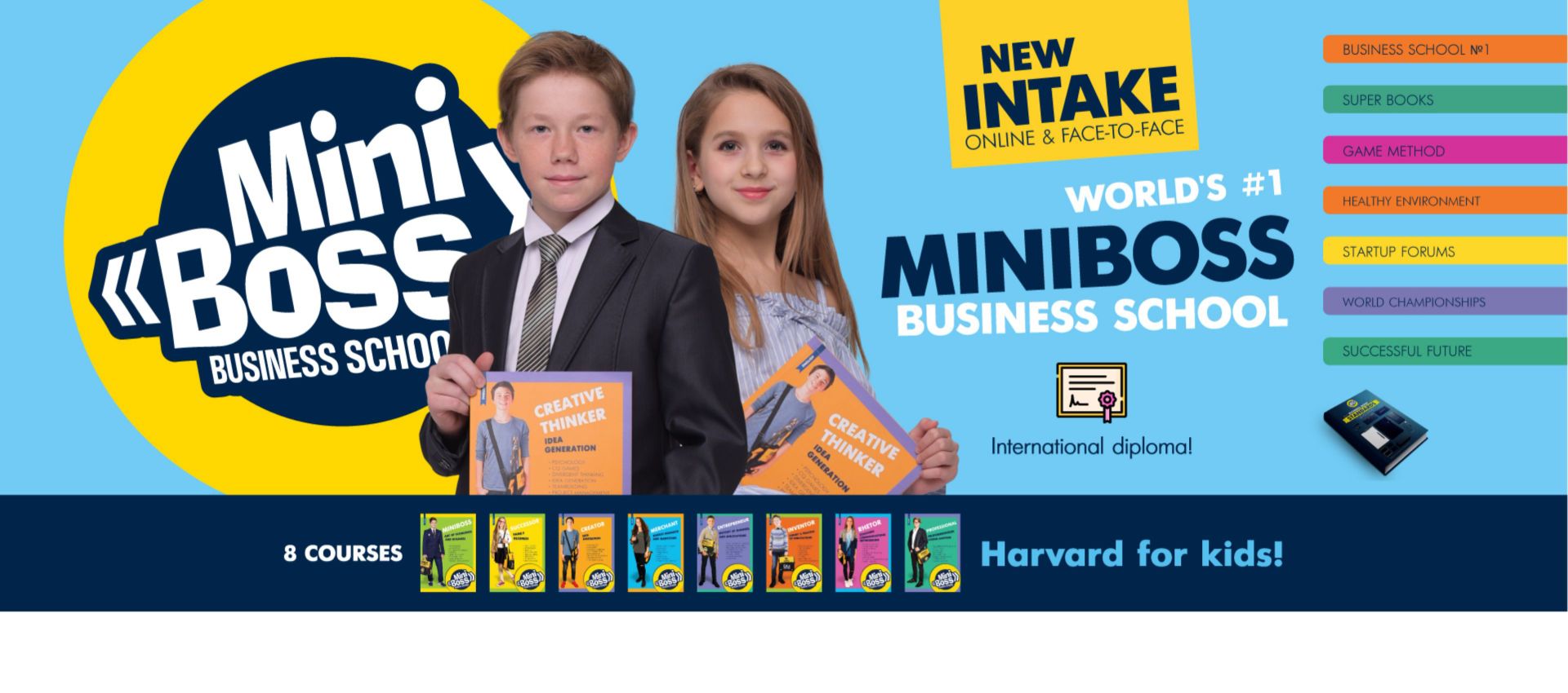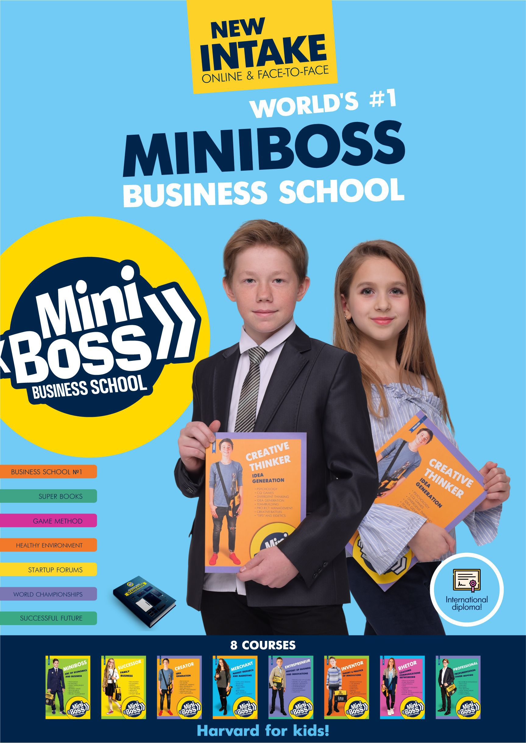 The International MiniBoss Business School Diploma (UK) is internationally recognized and opens the door to the world's most prestigious universities! It will definitely help your children to create successful career and family life. In fact, MiniBoss Diploma is a statement by itself that your child is HAPPY and SUCCESSFUL!
